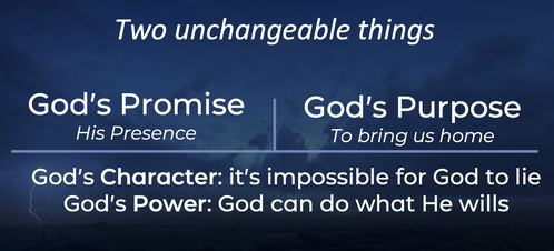 The two unchangeable things are from the previous verse: God’s promise and God’s purpose. The promise is that we will be with him forever; that is, his presence. This is the final outworking of our salvation – we will be with him. The purpose, the boulḗ - the thing God is going to accomplish – God is going to bring us home to be with himself. And so we have his purpose and his promise – and this is the point of these verses – we can trust God to do both.