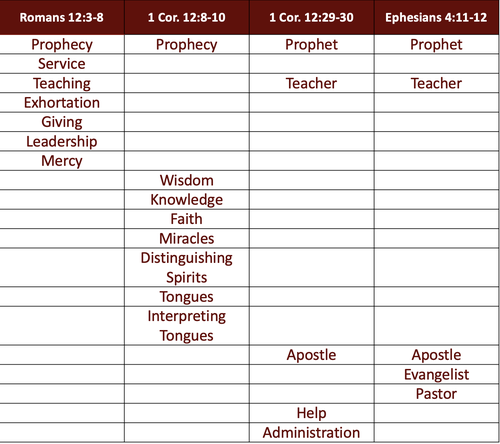 There are four primary lists of gifts in the New Testament (Romans 12:3-8, 1 Cor. 12:8-10, 1 Cor. 12:29-30; Ephesians 4:11-12) and none of them is exactly the same, but there is a good bit of overlap. These lists are not intended to be exhaustive or complete. They are all sample lists of how the Holy Spirit can work in and through believers. They are ad hoc, given in each case to support the point that Paul is making in each context.I’ve put them up on a church here so that you can see what gifts are in which lists: